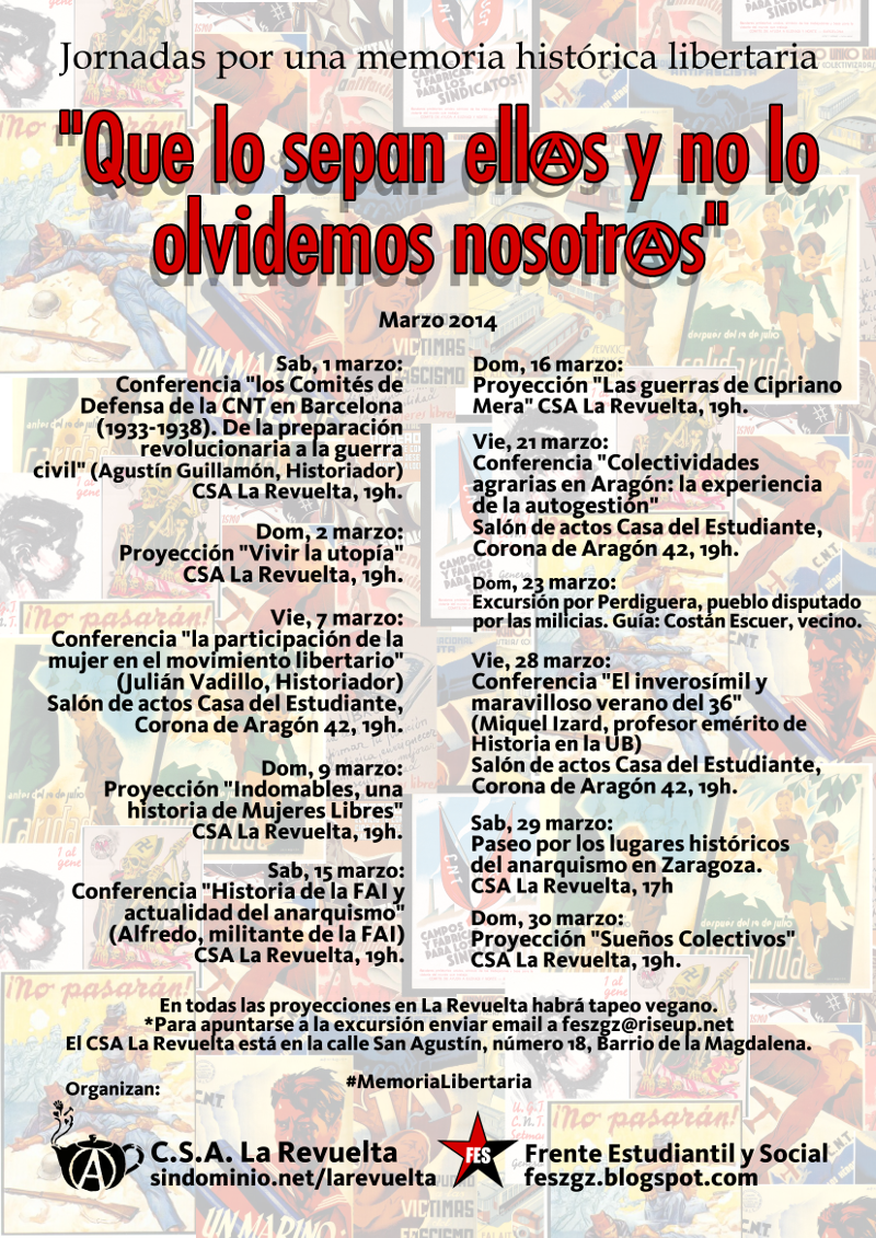 El Frente Estudiantil y Social (FES) y el Centro Social Anarquista La Revuelta organizan en Zaragoza, desde este sábado 1 de marzo y durante todo el mes, unas jornadas por “una memoria histórica libertaria” bajo el título ‘Que lo sepan ell@s y no lo olvidemos nosotr@s‘.